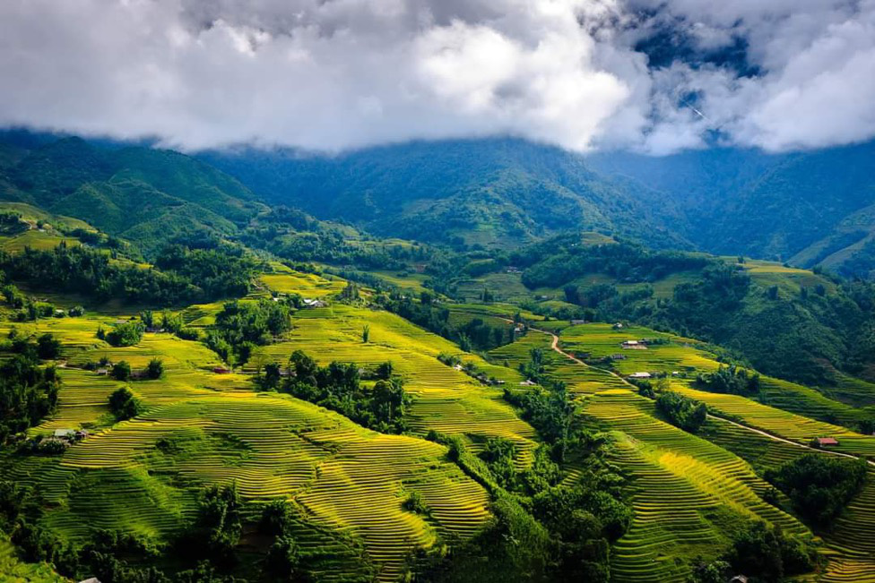 Ở nơi ấy, trong không khí se se lạnh đầu thu, những thửa ruộng bậc thang cao vút tầng mây đang vào vụ thu hoạch, dần chuyển từ xanh thắm sang óng vàng, tựa như những dải lụa mềm mại trải dài từ chân núi đến tận chân trời