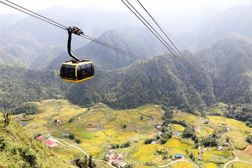 Trải nghiệm ngắm lúa chín tại Sa Pa cũng nhất định không thể bỏ qua chuyến du hành bay trên mùa vàng bằng cáp treo Fansipan. Từ trên cabin cáp treo, thu vào tầm mắt là trọn vẹn khung cảnh thung lũng Mường Hoa rực rỡ, đẹp như một bức tranh siêu thực với vô số mảng vàng đa sắc xen kẽ những đường cong mềm mại. Cảnh sắc cứ chầm chậm trôi qua ô cửa cabin khiến du khách có cảm giác như đang được chiêm ngưỡng những thước phim tuyệt đẹp của thiên nhiên Tây Bắc vào mùa đẹp nhất trong năm