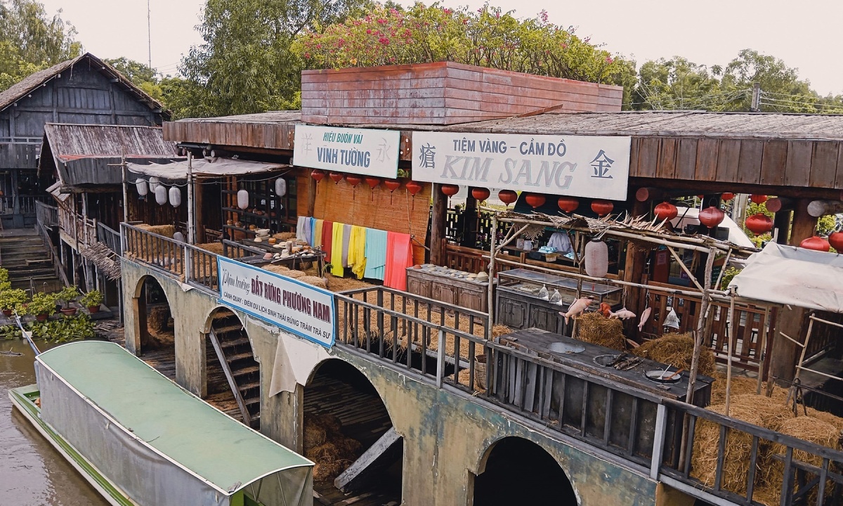 Trên bờ, một số nhà lá, gian hàng, biển hiệu đạo cụ của bộ phim được giữ nguyên trạng để du khách tham quan, check-in. Nhiều góc bối cảnh của phim với quầy bán thịt, hiệu buôn vải, tiệm vàng – cầm đồ của ông Ba Sang (NSƯT Trung Dân đóng) đã được giữ lại.