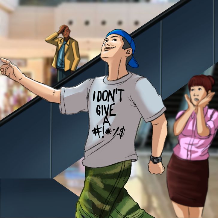 Nếu muốn một chuyến bay yên bình nhất có thể, hãy hạn chế các loại trang phục có hình ảnh hoặc slogan quá kích động. Nếu vô tình xúc phạm ai đó, bạn không thể biết phản ứng của người ta là gì. Hơn nữa trên máy bay có cả trẻ em, nên tốt nhất là tránh những hình ảnh quá nhạy cảm đi.